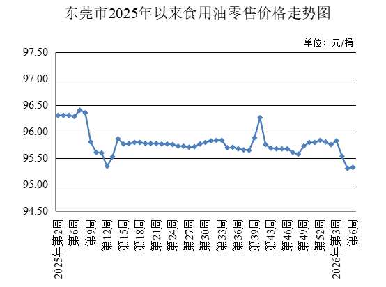 第6周,监测的4种粮食农贸市场零售均价为每500克3.33元,与上周持平。其中,3种大米农贸市场零售均价为每500克3.32元,与上周持平;面粉农贸市场零售均价为每500克3.36元,与上周持平。5L桶装食用油农贸市场零售均价为每桶95.32元,较上周上升0.02%。