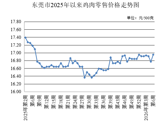 第6周,监测的牛肉农贸市场零售均价为每500克47.70元,与上周持平。鸡肉农贸市场零售均价为每500克16.95元,较上周上升1.07%。