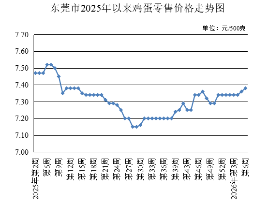 第6周,监测的鸡蛋农贸市场零售均价为每500克7.38元,较上周上升0.27%。
