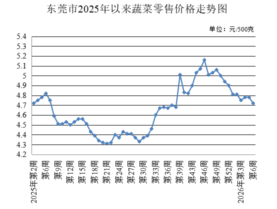 第6周,监测的30种蔬菜农贸市场零售均价为每500克4.72元,较上周下降1.26%。其中,13种叶菜类农贸市场零售均价为每500克4.85元,较上周下降1.62%;17种非叶菜类农贸市场零售均价为每500克4.63元,较上周下降0.64%。